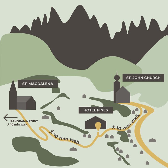 Wir erwarten Sie inmitten von St. Magdalena, einem idyllischen und herrlich gelegenen Dorf in Villnöss auf rund 1.300 Höhenmetern. Morgens aufwachen in der wundervollen Berglandschaft der Dolomiten, direkt unter den beeindruckenden Felswänden der Geislergruppe - das ist Urlaub im Hotel Fines.
